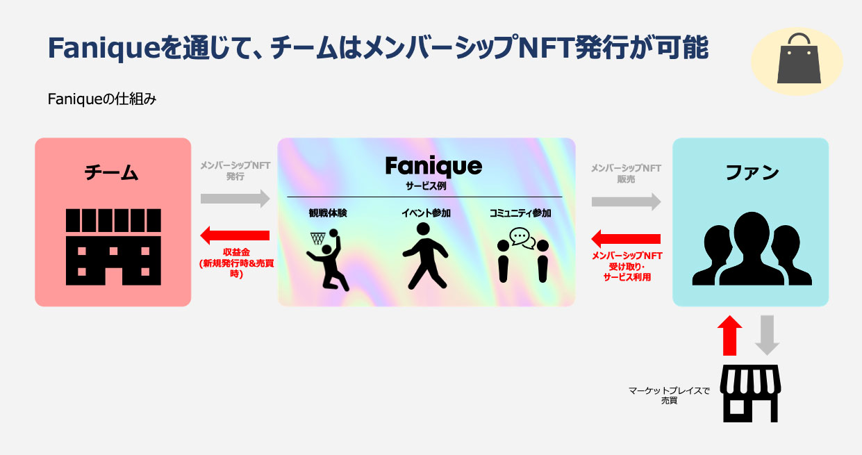 Faniqueは、NFTとファンクラブの機能を融合した、新しい形態のファンクラブサービスです。スポーツチームは、メンバーシップNFTを発行することができます。メンバーシップNFTを活用することで、従来のファンクラブの機能に加え、チームの重要な意思決定に関与することやチームや選手への応援量が価値となり所有することが可能になります。